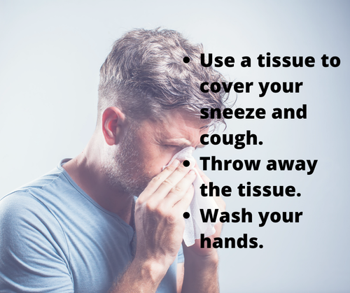 When you sneeze or cough help keep the germs from spreading by covering your mouth and nose with a tissue or the crook of your elbow. Using a tissue is the best way to do this as you can throw the tissue away. After you have thrown the tissue away wash or sanitize your hands. Make a conscious effort to keep your hands off your face, especially your eyes, nose, and mouth.