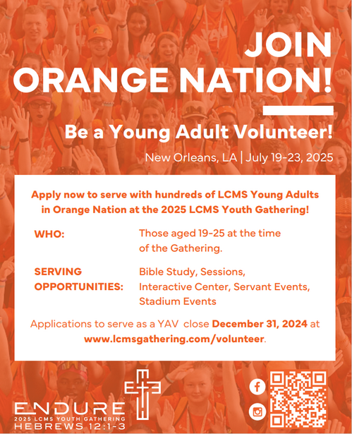 Christ Our Savior will be assisting with those that want to volunteer. Those interested must be 19-25 years of age at the time of the LCMS Gathering next year. For more information, please contact Amy Kuszynski through email (amykuszynski@gmail.com) for more details.
